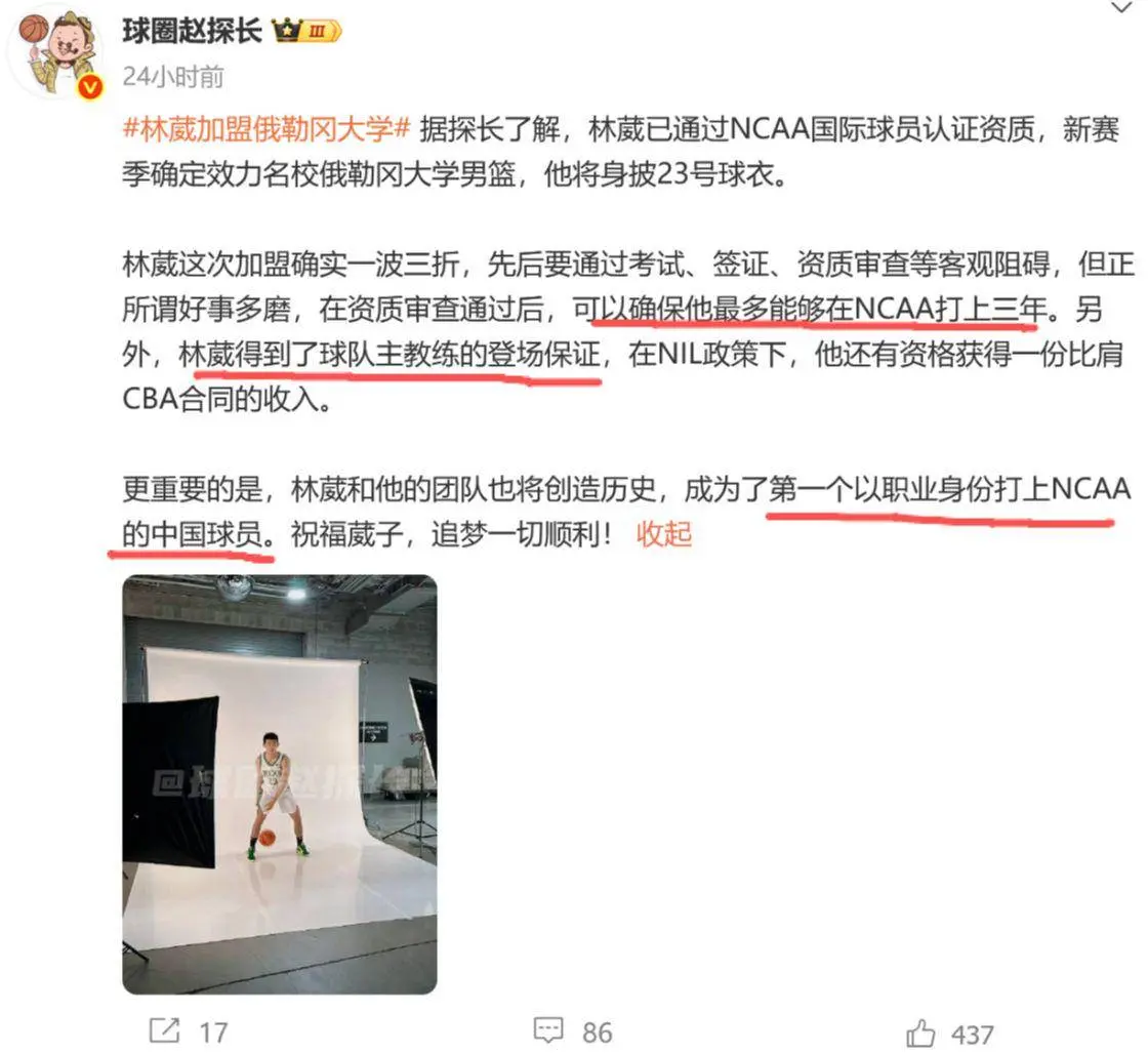 此前便有林葳要加盟NCAA俄勒冈大学的消息传出,但直到10月2日,其中方经纪公司精英传奇体育才正式官宣,林葳新赛季加盟俄勒冈大学。作为首个加盟NCAA,且还是NCAA篮球名校的职业球员,21岁的林葳也还算比较年轻,考虑到这几年NIL政策的推出,林葳去到NCAA有球打且薪水方面也有所保障,确实比他在CBA躺平更加明智。